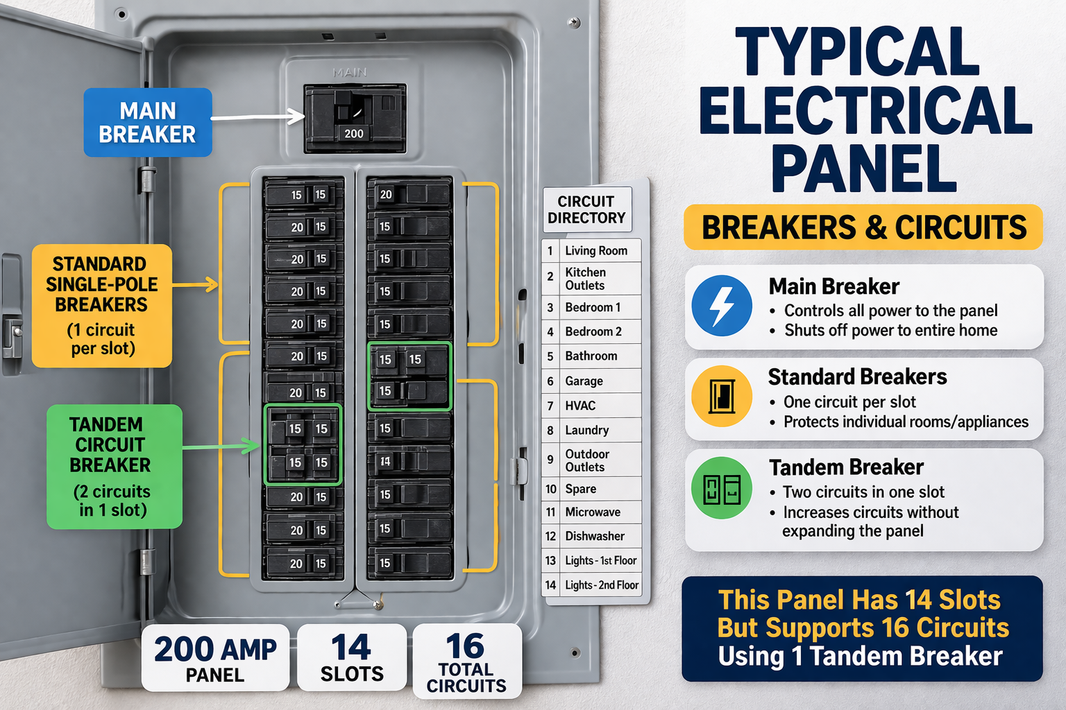 Tandem breakers can increase the number of circuits in a panel without expanding its size. However, they are only allowed in panels that are specifically designed to accept them.